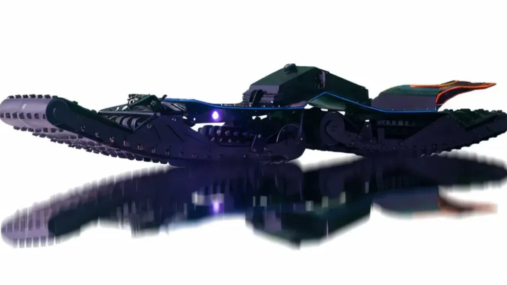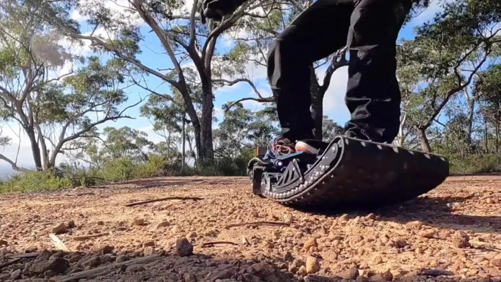 El Vendetta no es ligero; pesa unos 30 kilos y está construido con materiales como aluminio y fibra de carbono. Cada una de sus orugas cuenta con su propio motor eléctrico y un sistema independiente de control de tracción que se adapta al terreno. La energía procede de baterías de litio intercambiables situadas entre los pies del usuario, lo que permite sustituirlas con facilidad cuando se agotan.